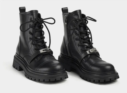 Mylu | DARING | Genuine Leather Combat Boots | Metallic Buckle Detail Ankle Boots | Round Toe Platform Sole