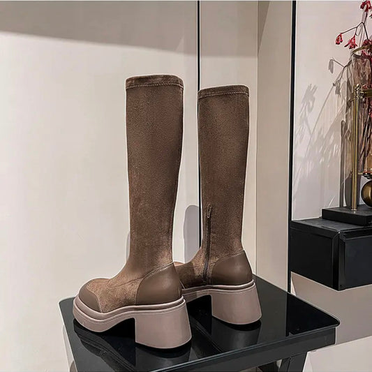 Mylu | SVELTE | Women's Leather & Fabric Boots | Round Toe Block Heel | Knee Length