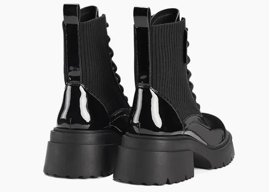 Mylu | LUSTER in Black | Women's Leather Fabric Blend Combat Boots | Round Toe Laced Platform Boots